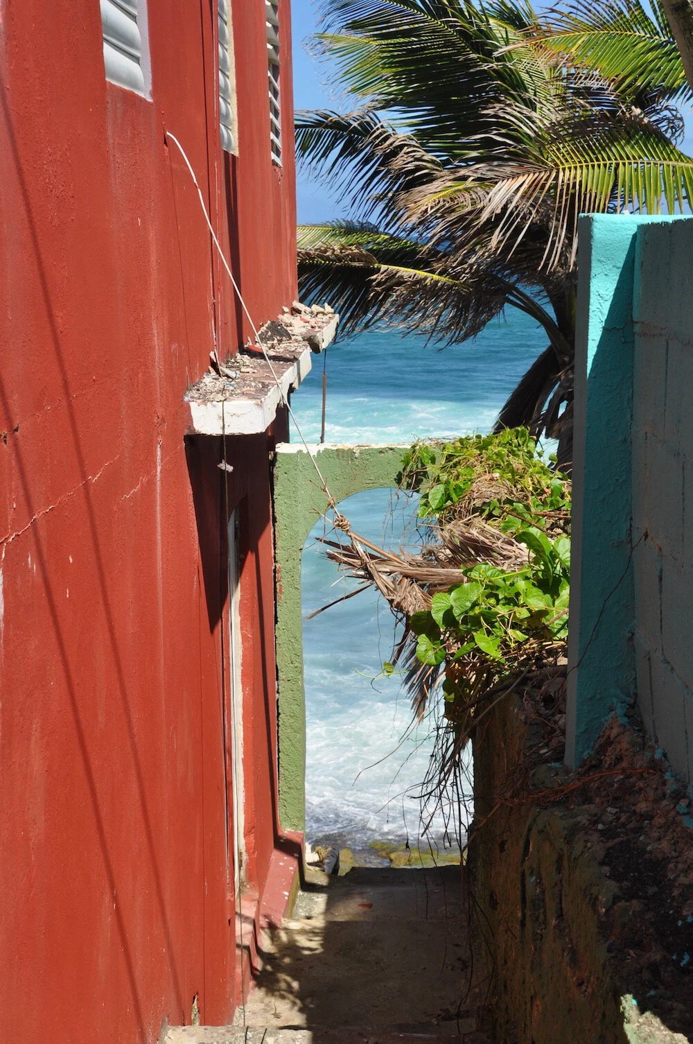 Walking through the narrow streets, an archway perfectly frames the turquoise blue waters of the Caribbean Sea. La Perla, Puerto Rico