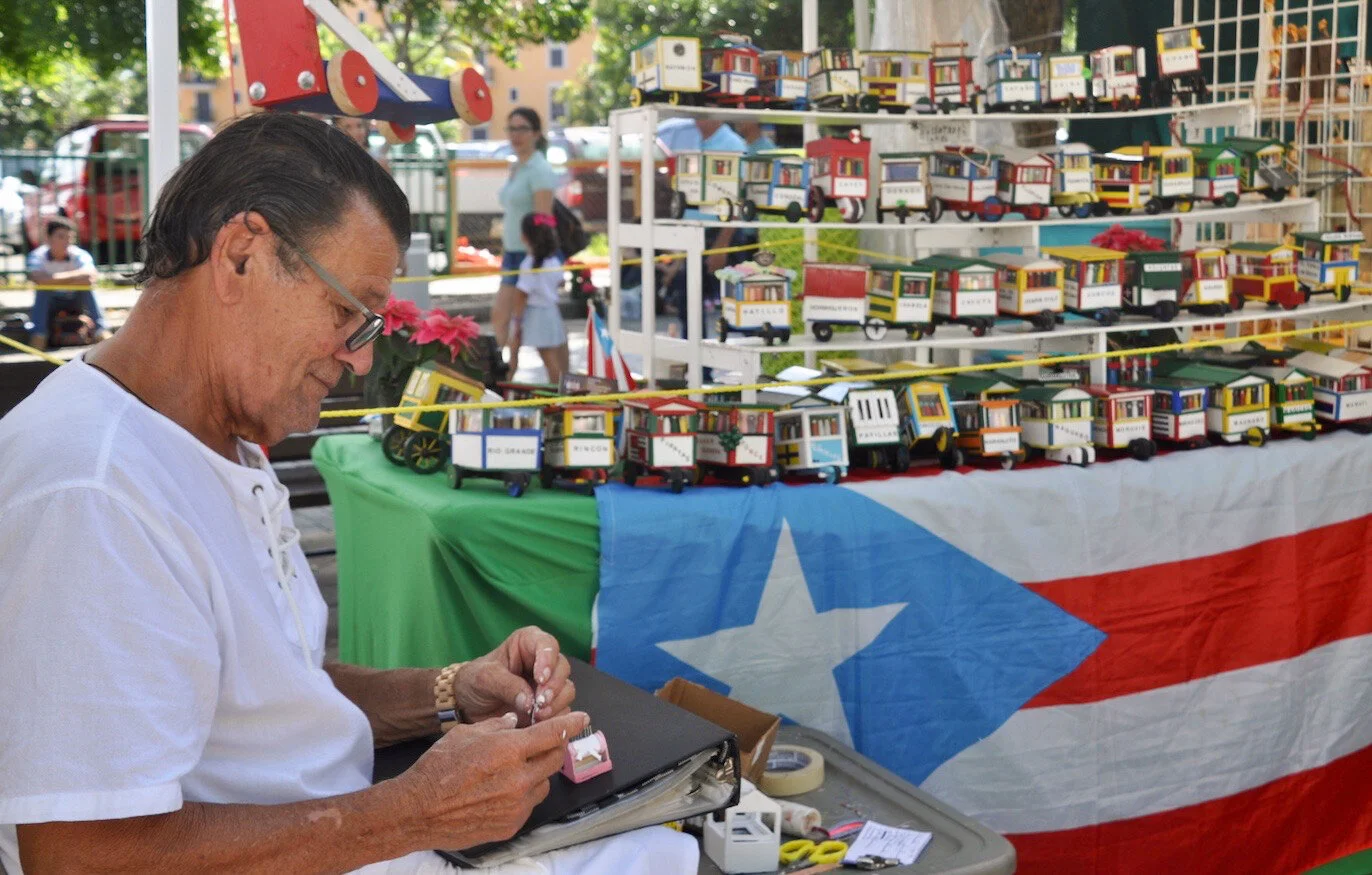 A Puerto Rican artisan’s hands hold tight to a dying art form, by creating wooden representations of traditional ‘piragua' carts. Old San Juan, Puerto Rico